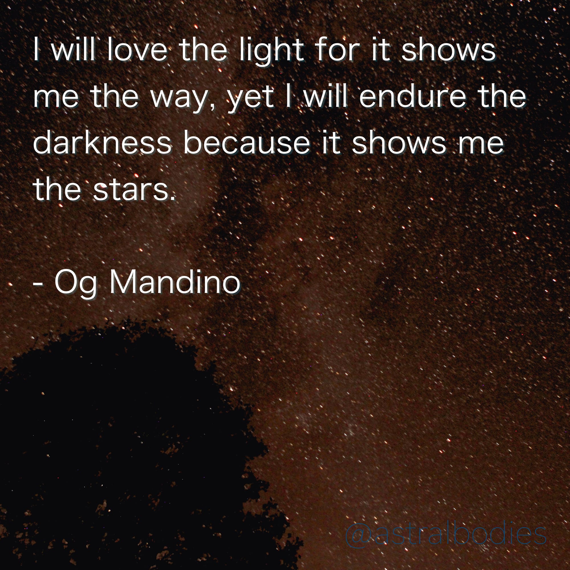 I saw this quote on a friend's wall as I was leaving their house. I found the original and decided to share it here. I will love the light for it shows me the way, yet I will endure the darkness because it shows me the stars. Og Mandino